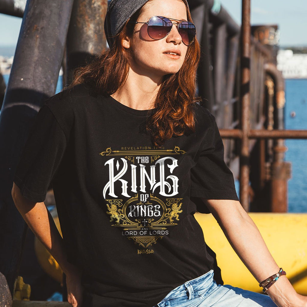 Pay tribute to Jesus in this œThe King T-Shirt in Black by Kerusso®. Dancing lions and royal details surround a powerful message of faith: Jesus is the King of Kings and the Lord of Lords, supreme above all other rulers. We can honor God with our actions, with our words, and even in the way we dress.