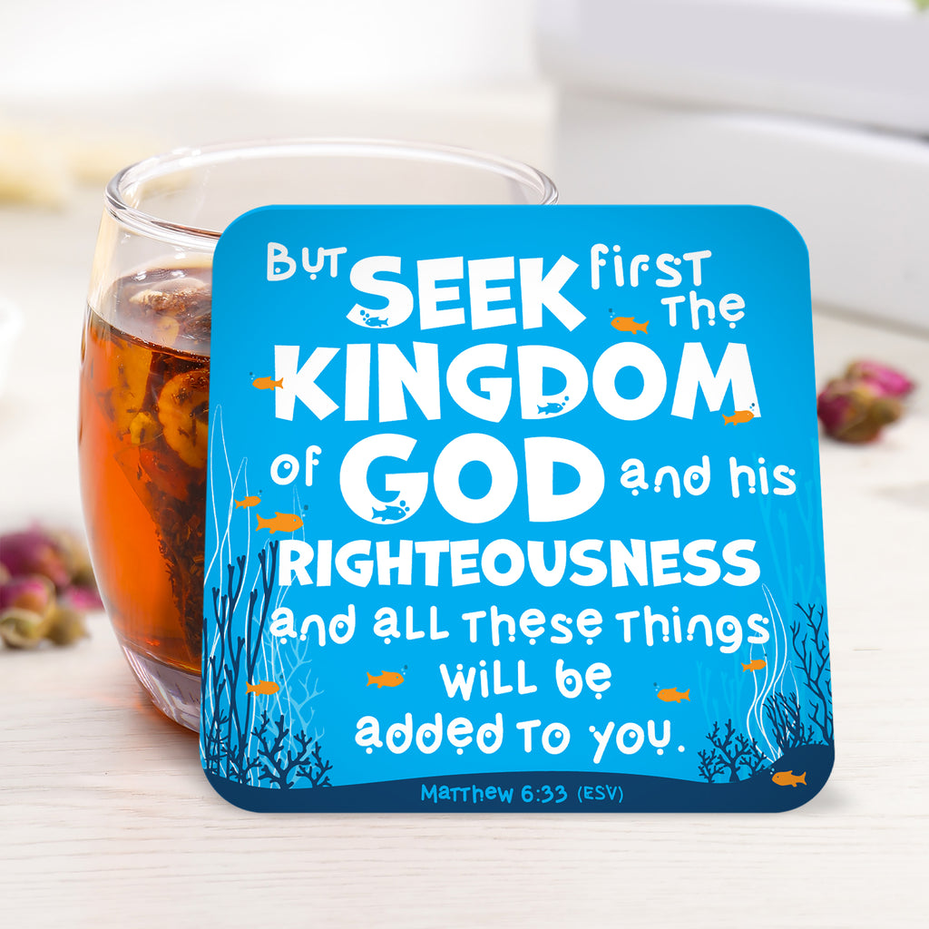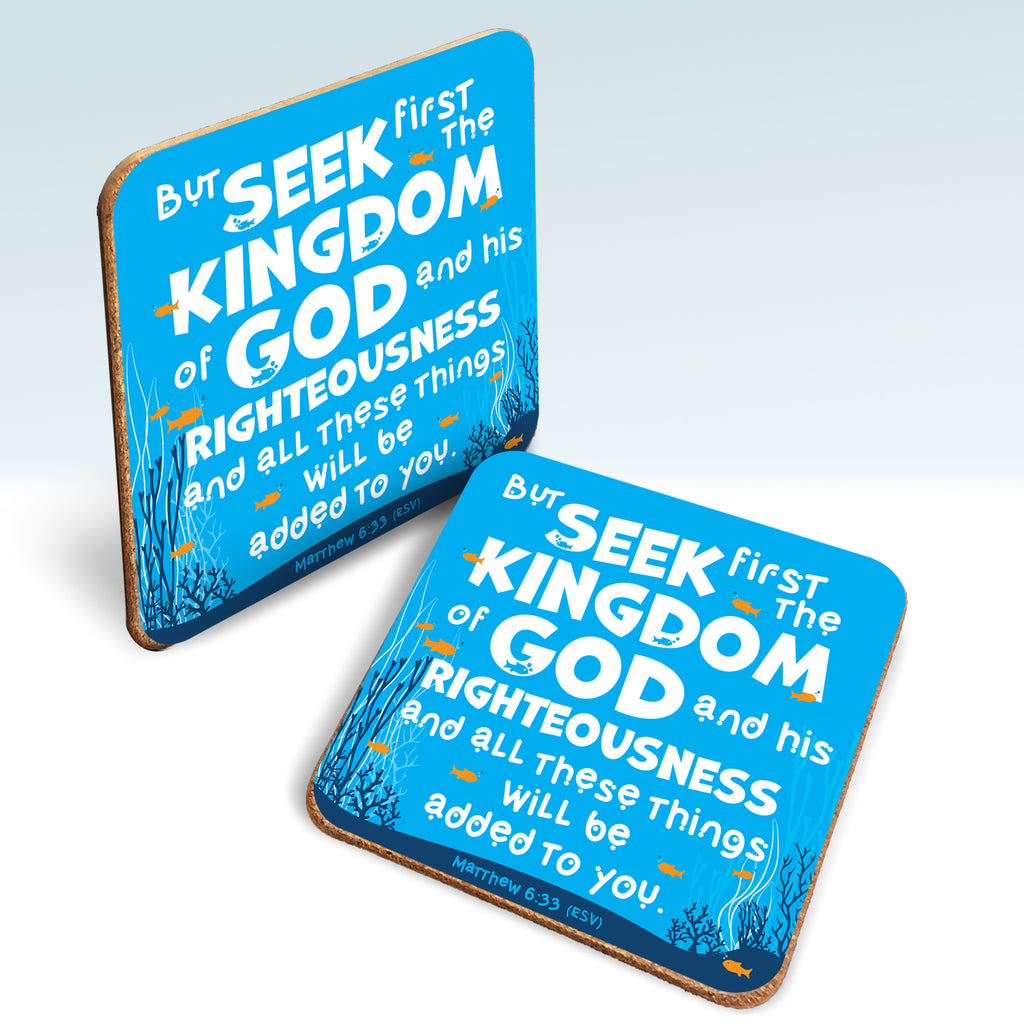 Wording on coaster: ‘‘But seek first the kingdom of God and his righteousness and all these things will be added to you’. Matthew 6:33