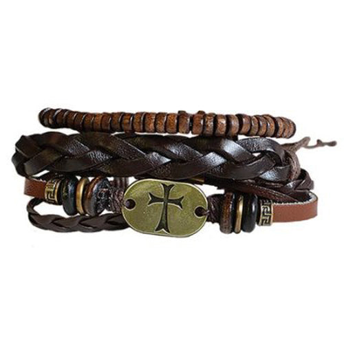 Express your faith in our Faith Gear® Guys “Gold Cross” Bracelet combo. This distinctive trio of bracelets offers a rugged look in multiple leather treatments, a vintage-style cross that is cast on an Antique Gold oval, and complimentary beads. Each bracelet is adjustable, and together they make a contemporary statement of faith that pairs well with both casual and dressy attire.