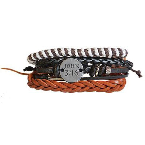 Express your faith in our Faith Gear Guy's “John 3:16 Multi” Bracelet combo. This distinctive trio of bracelets offers a rugged, layered look comprised of multiple leather treatments with the words “John 3:16” cast in vintage font on a round oval medallion with complimentary beads. Each bracelet is adjustable, and together they make a contemporary statement of faith that pairs well with both casual and dressy attire.