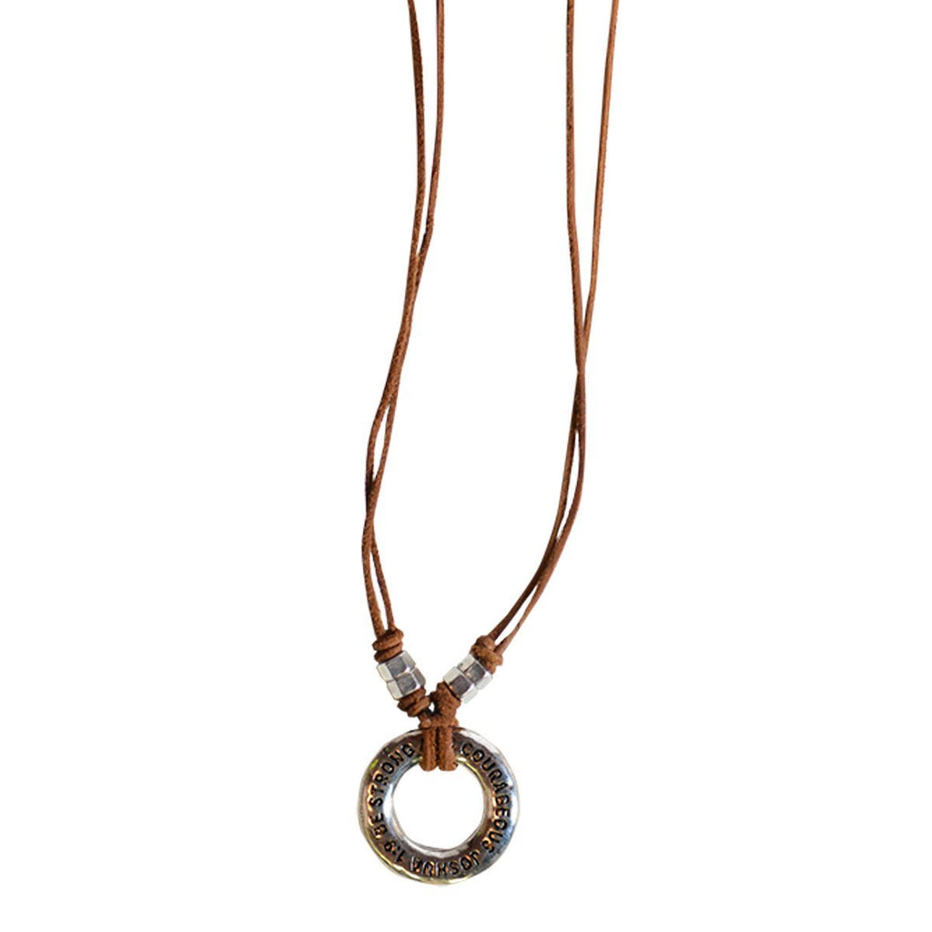 A handcrafted look and feel characterize this rugged necklace, including a medium brown leather necklace with silver accent hex nut beads and a stamped silver-tone pendant. Wear this accessory as a testament to your faith, and a reminder to give God the credit. Walk confidently in your faith, and point to Jesus every time you wear this unique necklace just for the guys. #faithgear #bestrongandcourageous