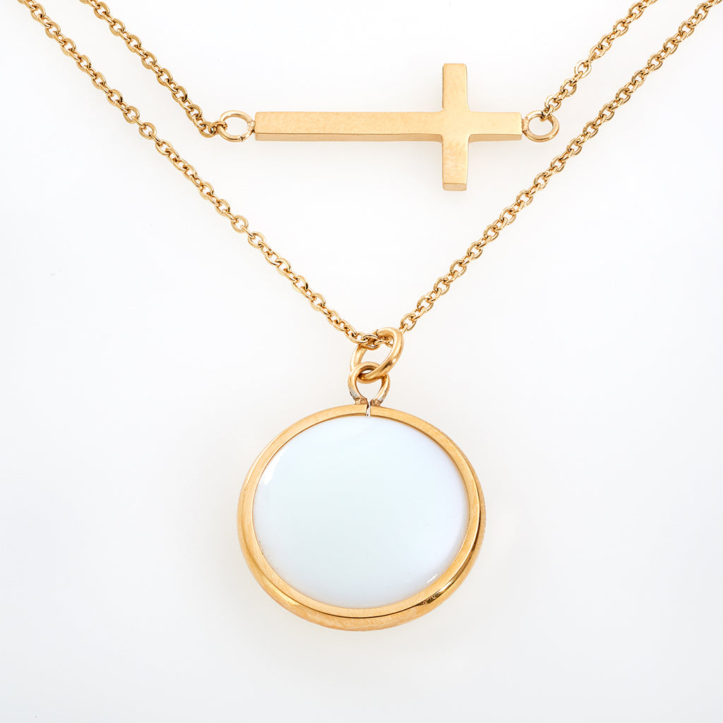 The Cross And Moonstone Necklace is made of 316 stainless steel 14 carat gold plating with a lobster claw closure. One strand on the Christian moonstone necklace has a cross displayed horizontally, from the lower strand on the gold necklace hangs a moonstone pendant.