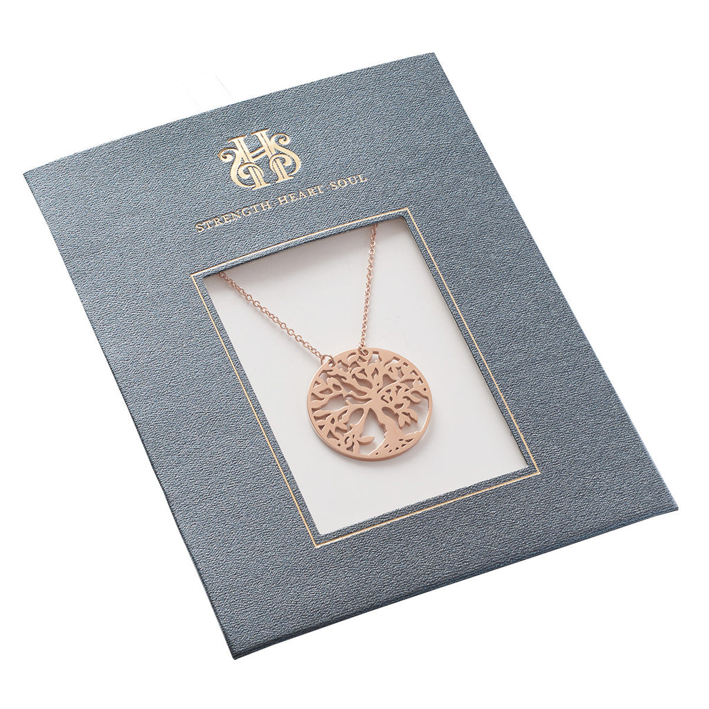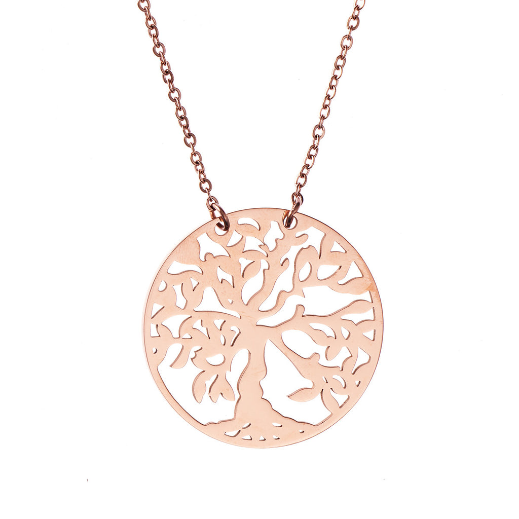 This Christian necklace is made of 316 stainless steel with 14 carat rose gold plating. The poignant design of a tree is die cut inside the disc necklace and will stand out with any outfit when you wear the rose gold necklace.