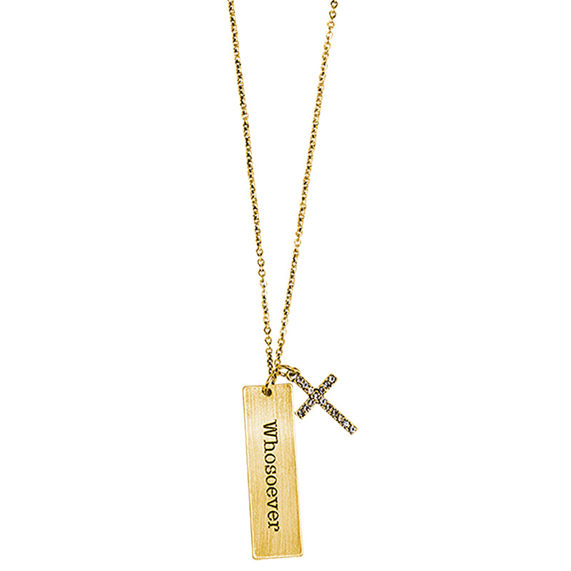 Share your belief in God when you wear this “Tab-Whosoever” Faith Gear Women’s Fashion Jewelry Necklace in Gold. This modern pendant includes a dangling rhinestone cross charm for movement and bling. It’s the kind of pendant your mother would pass down from her youth, and you will love wearing this stylish accessory or giving it as a gift to someone special. It’s that extra bit of sparkle you need to take any outfit to the next level.
