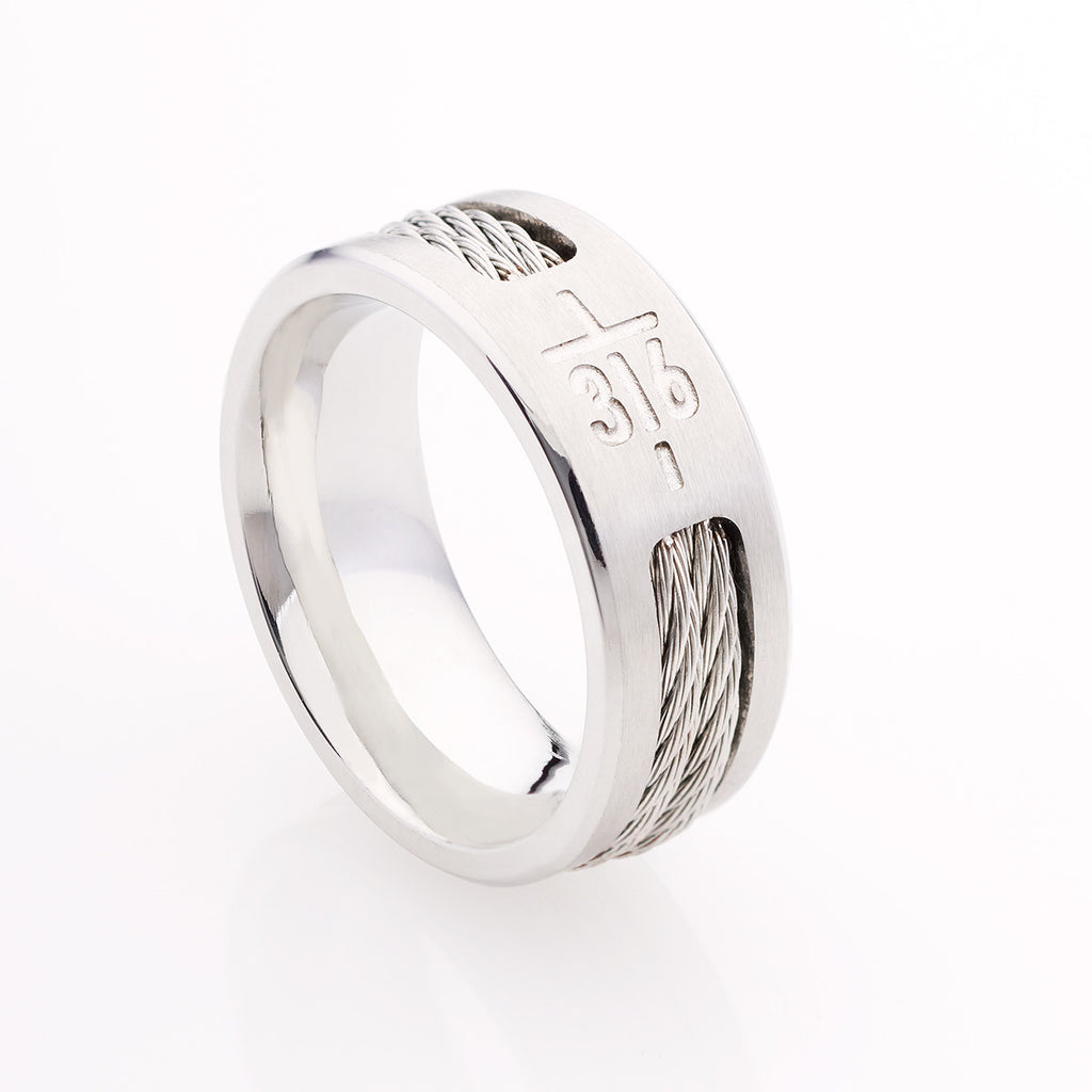 This exquisitely crafted men's ring references the profound message of God's love for the world found in John 3:16. This stainless steel ring features a double row wire accent with a laser engraved cross and Scripture reference from John 3:16. The overall design gives it a rugged yet sophisticated look.