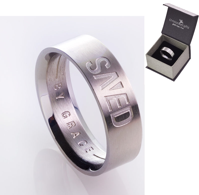 This contemporary stainless steel men's ring is exquisitely crafted and stunningly designed. It gives a wonderful reminder of God's loving grace through His son Jesus Christ as found in the Scripture verse Ephesians 2:8. The top has the word "saved" in a brushed finish with the words "by grace" stamped on the inside. The subtle interior polished beveled edge completes the look.