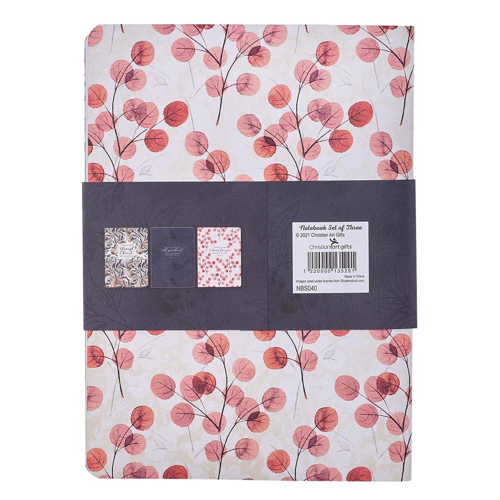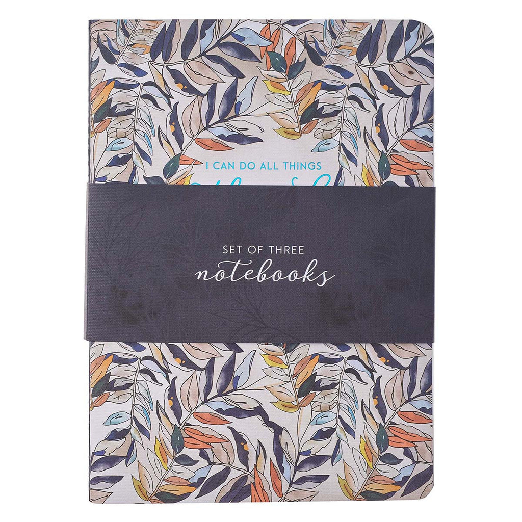 The three notebooks in the Through Christ Navy Floral Large Notebook Set are inscribed with encouraging words from Scripture meant to uplift your soul when you sit down for your personal devotional time.