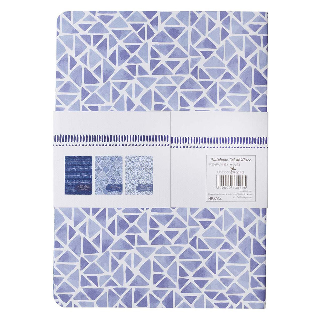 Each of the notebooks in the three-piece set features a unique geometrical design in shades of blue accented with a gold foiled title. The lay-flat, saddle stitched binding makes it easy to write on the 64 lined pages. This notebook set promotes a positive message while performing a practical function. Its size makes it ideal for journaling and taking class or sermon notes.