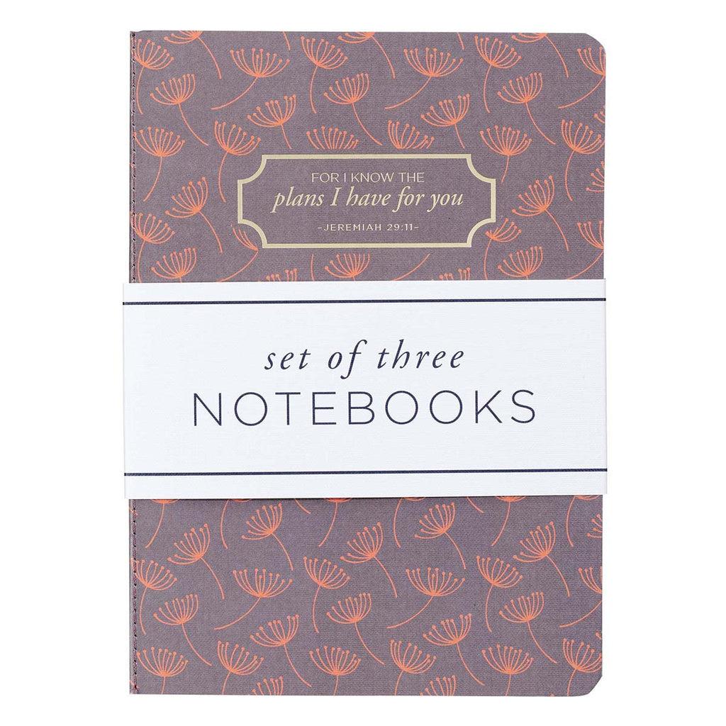 The three large notebooks each have their own two-tone color scheme: a dull purple background is paired with vibrant orange seeds, a soft peach background is paired with warm orange creepers, and a powder blue background is paired with eggplant purple shoots. Each one of the three notebooks features a section of the verse from Jeremiah 29:11 printed in gold foil, and together, the set contains the complete verse.