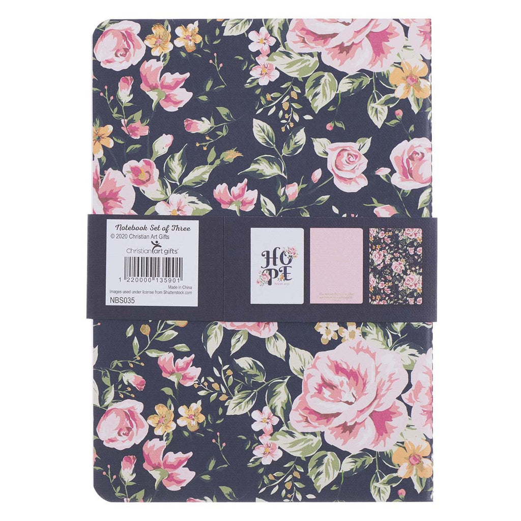 The decidedly feminine notebook set includes three notebooks in a crisp navy, white, and light pink palette. The top notebook in the set is white and has the lettersH O P E beautifully written in navy blue and accented with pink roses. "Isaiah 40:31" is printed below in pink foil. The navy blue notebook is covered with stunning pink roses while the light pink notebook shows a faint rose watermark design. The words from Isaiah 40:31,