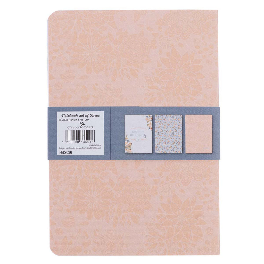 Set on a creamy white background, the first of the three notebooks in this set is decorated with a dainty bird perched on a branch filled with spring blossoms. The words from Lamentations 3:22-23 are printed as the title. Silver foiled accents are added for an elegant feel.
