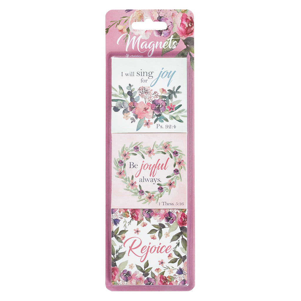 The magnets follow a pink and white theme with tranquil floral designs in pinks, purples, and greens. Text and Scripture are displayed on the Rejoice Magnet Set.