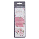 The pink floral theme is carried through the design of each magnet. Two of the magnets are decorated in pink florals, and a Scripture verse while the third magnet only pictures a bouquet of flowers. Scripture displayed on these magnets include: