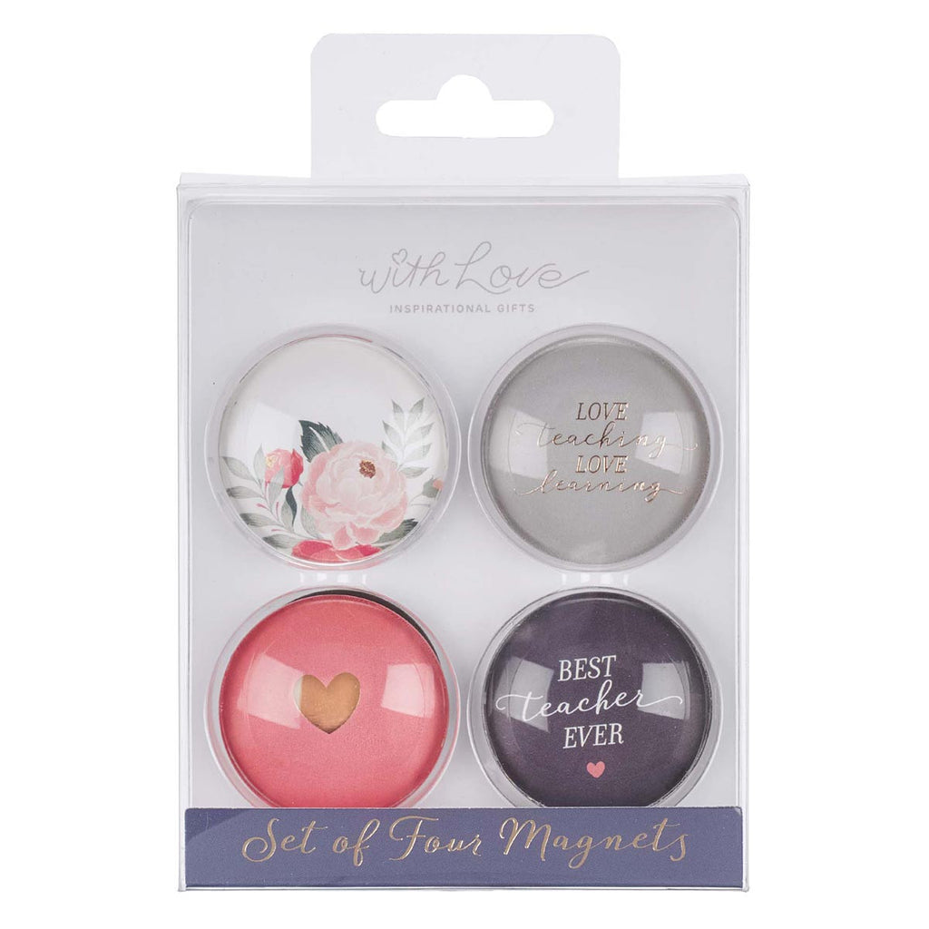 This acetate-packaged set includes four 1.75" circular magnets. While these magnets make a wonderful gift, they also pair impeccably with the rest of the items in the Best Teacher Ever Collection, that includes a variety of practical yet beautiful gifts for teachers: calendars, wirebound journals, mugs and water bottles, key rings, and pencil pouches, all with coordinating designs and color palettes.