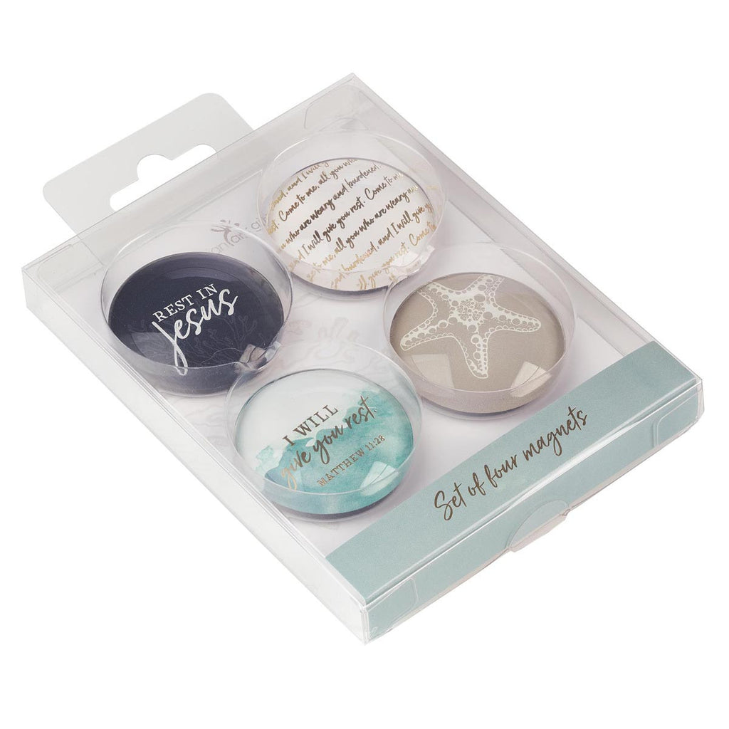 These 44 mm magnets proclaim its message with a beach motif! œRest in Jesus has white letters on a seafoam background; œI will give you rest is placed against ocean waves; œCome to me all you who are weary and burdened has sandy brown lettering against a white background while the accent magnet shows a starfish image. This also makes a great gift for people at work or church who are facing tough times!