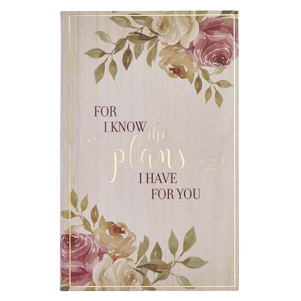 The beautiful flexcover journal is ideal as a small journal to keep in your desk or on the kitchen counter. Or, take it on the go in your purse, briefcase, or backpack. Place a copy in a Christmas stocking or Easter basket as a way to encourage a friend or family member. No matter how you choose to use it, the For I Know the Plans Flexcover Journal is easy to use and the perfect git for any woman who likes to write!