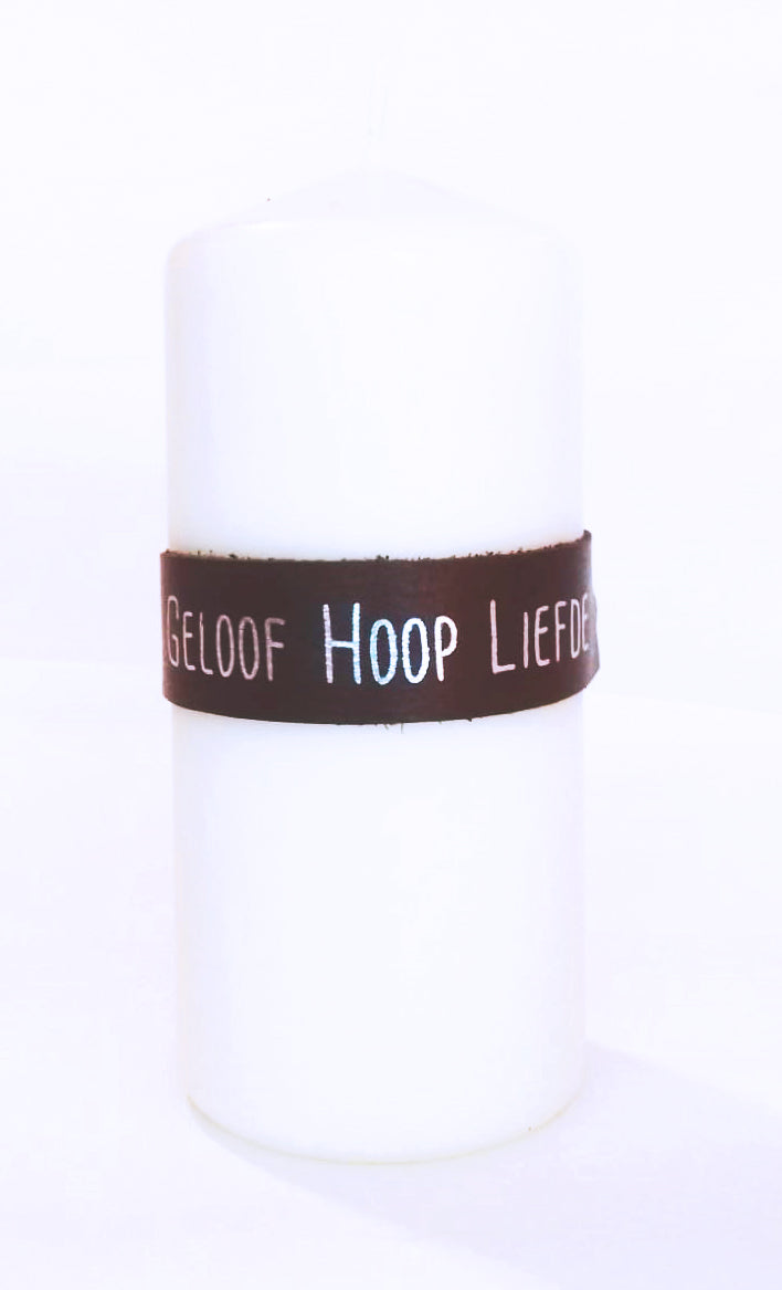 Breng een gezellige sfeer in huis. Prachtige kaars in ivoor kleur die een mooi sfeerlicht geeft. Versier met herbruikbare leren band op haar plaats gehouden door elastiek.