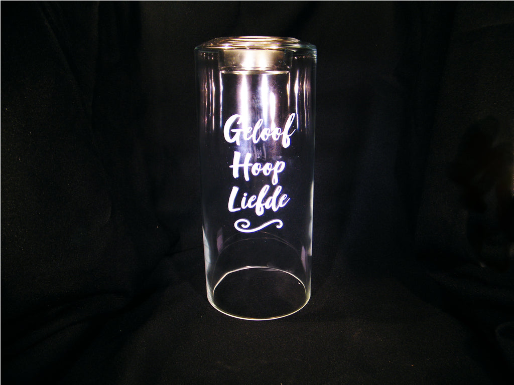 Op het glas is een bijbelvers gedrukt, erg mooi! Zo is hij zowel overdag als in de avond leuk om naar te kijken!