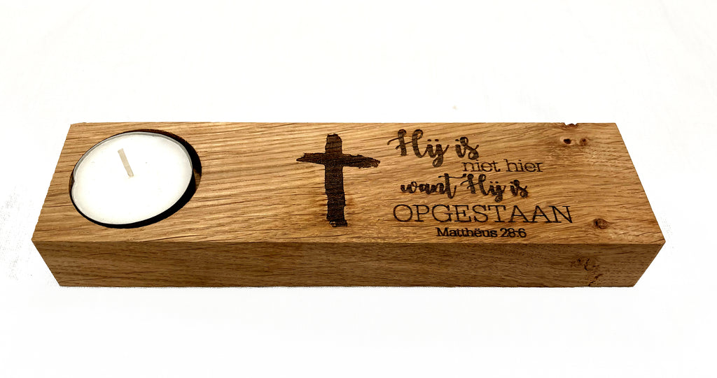 De waxinelicht kandelaar met de tekst "Hij is niet hier, Hij is opgestaan" is een bijzonder en uniek product. Het is handgemaakt van duurzame materialen, wat het een mileuvriendelijk product maakt. De tekst is een verwijzing naar de opstanding van Jezus Chrisus.