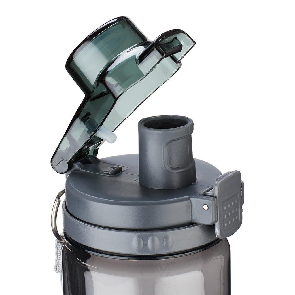 The black water bottle has a 28 fluid ounce capacity to keep your favorite drink close at hand. The lid has a push-button that releases a flip-top lid that, in turn, covers a spout. A rotating locking mechanism ensures no accidental spillage. Clean-up is easy when you remove the entire lid to wash in warm soapy water. The large mouth opening (2-inch diameter) allows you to easily fill the bottle, add ice, and clean it with a bottle brush. A webbed loop carrying handle is attached with a split keyring.