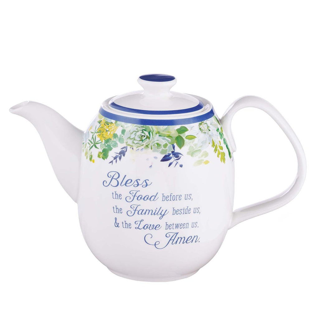 Practice hospitality when you pour a steaming cup of tea from this ceramic Bless The Food Before Us Teapot. Friends and family will feel loved and appreciated when they read the prayer printed in royal blue on the side of the ceramic teapot: