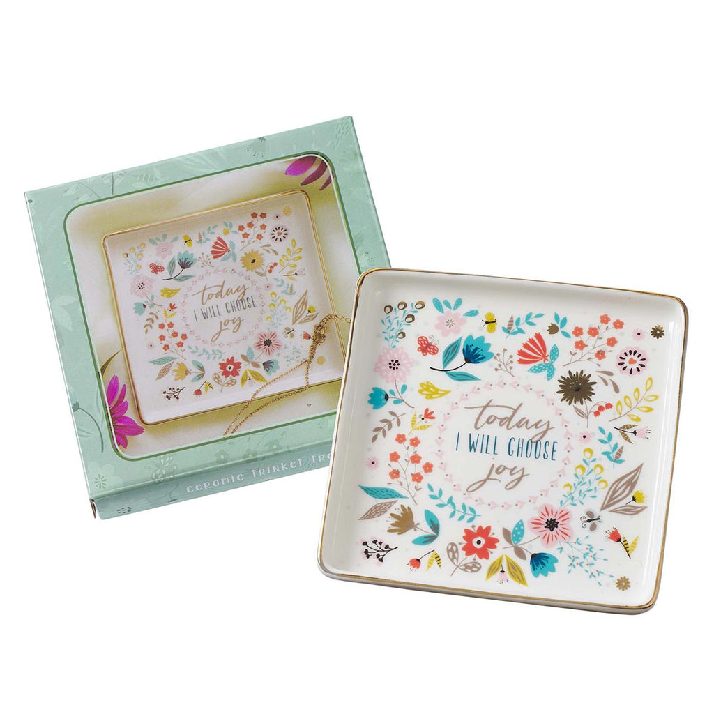 The ceramic trinket tray comes in a pastel floral design with “Today I Will Choose Joy” in the center. Packaged in a die-cut gift box, the Choose Joy Trinket Tray is not dishwasher, microwave, or freezer safe.