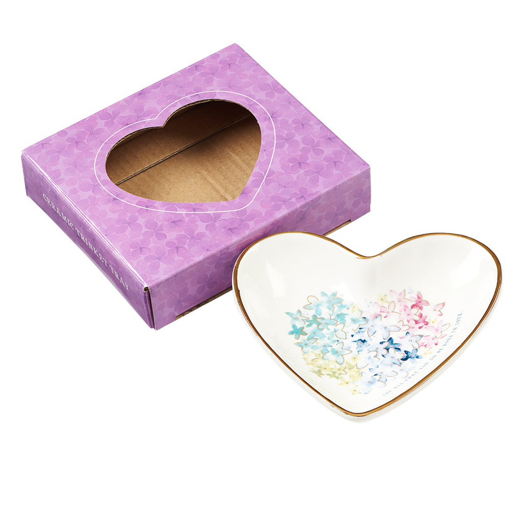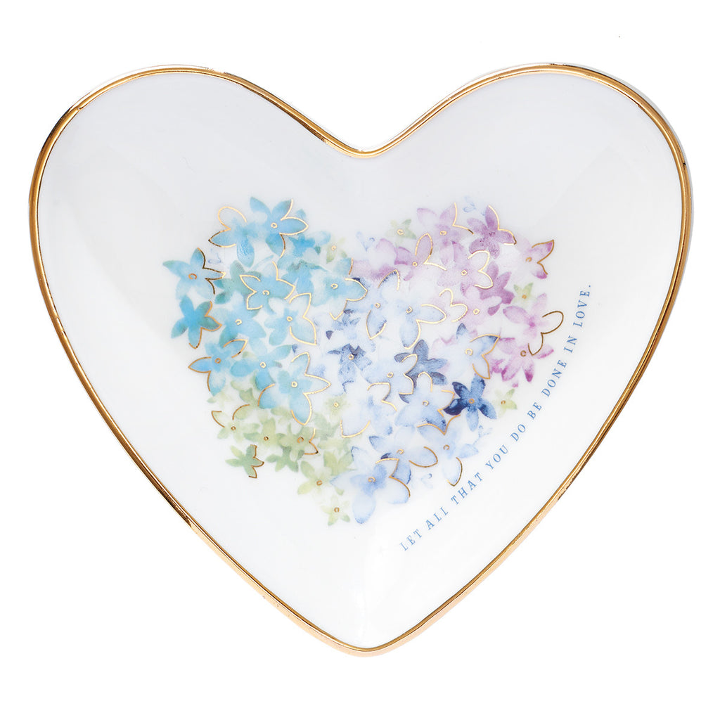 This charming heart-shaped tray features a delicate floral design. “Let all that you do be done in love” curves up one side of the heart. A gold edging finishes off this ceramic trinket.