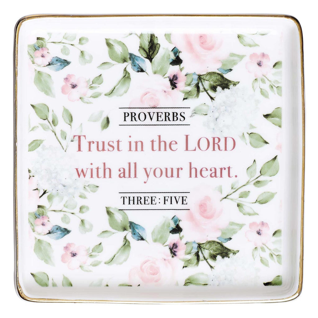 This Trust in the Lord Ceramic Trinket Tray features delicate pink roses and a gentle reminder to “Trust in the Lord with all your heart.” Promising to completely trust the Lord is a daily commitment, one that requires intentional action and seeing the words from Proverbs 3:5 will orient your heart towards God: