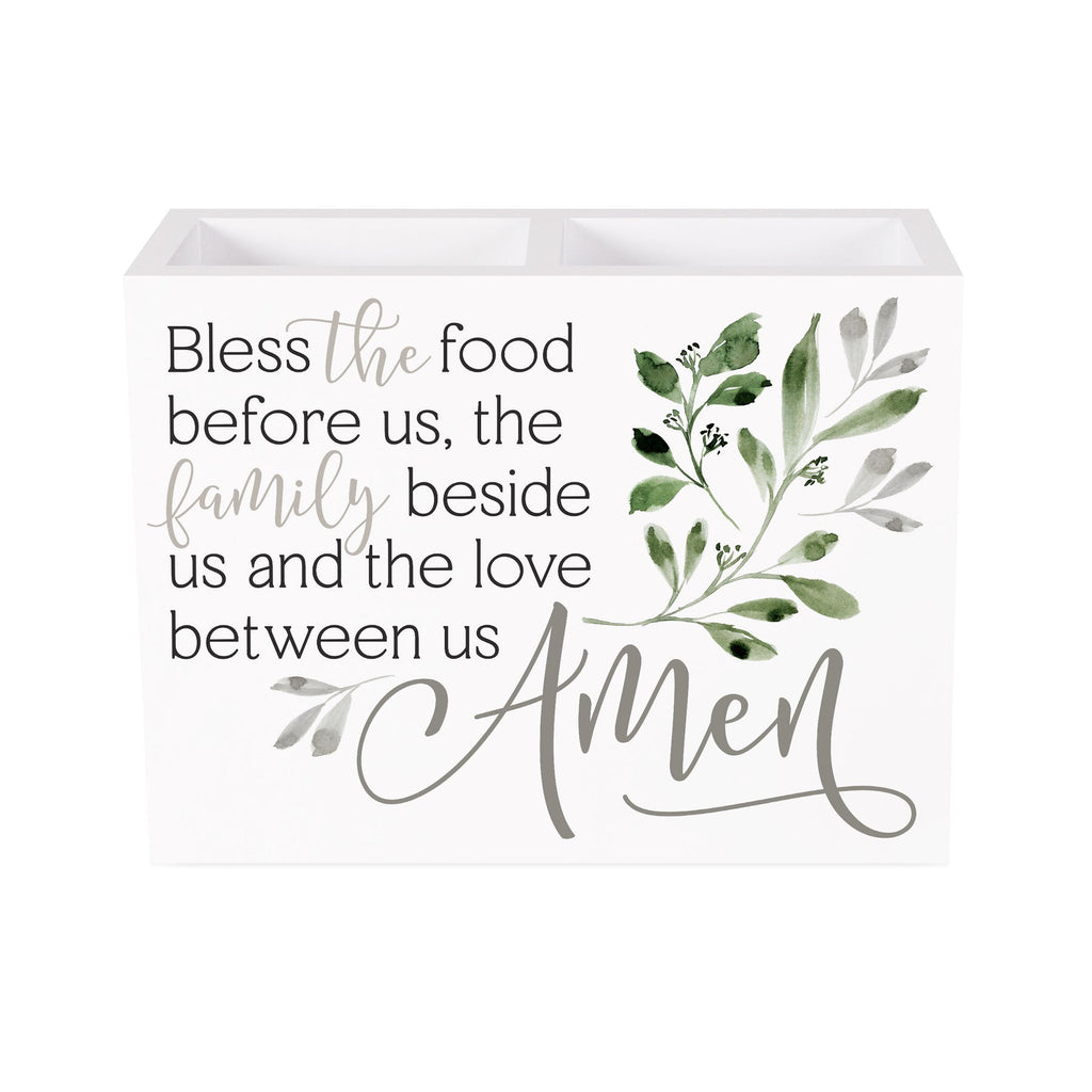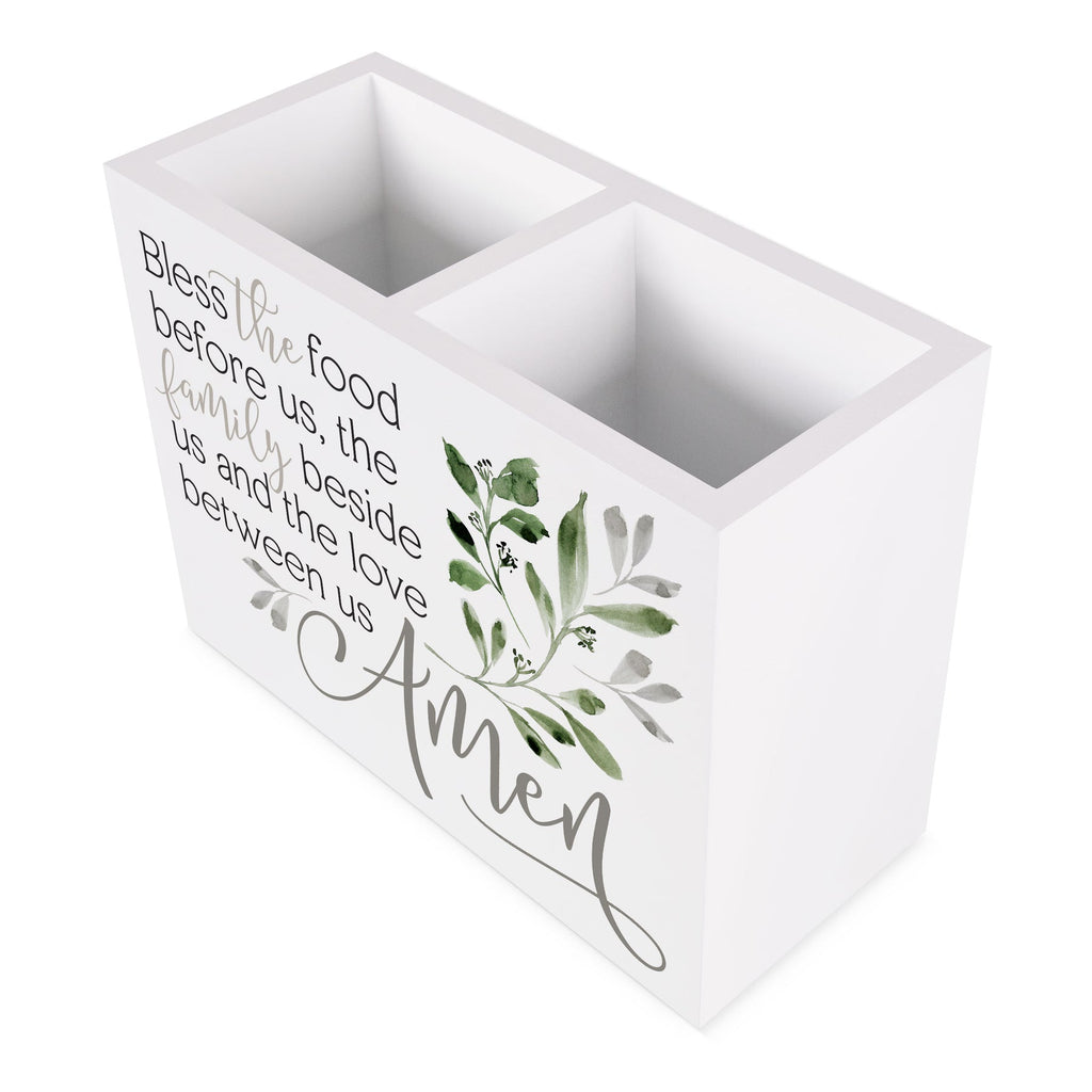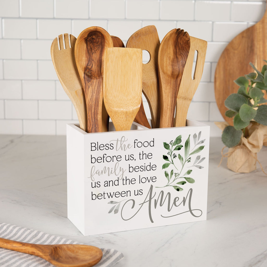 Clear the clutter and free up precious countertop space utilizing these wooden utensil holders. Clean white designs are paired with kitchen-inspired sentiments and artistic embellishments. Each features a center divider and provides ample storage and easy