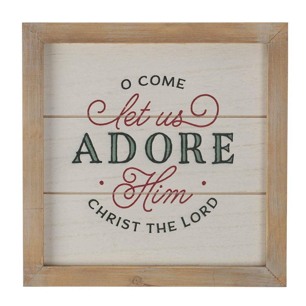 The Come Let US Adore Him Framed Wooden Wall Art is part of the O Come Let Us Adore Him Collection. This collection includes a ceramic coffee mug, resin ornament, ceramic ornament, ceramic plate, paper napkin set, wall art piece, and a gift bag.