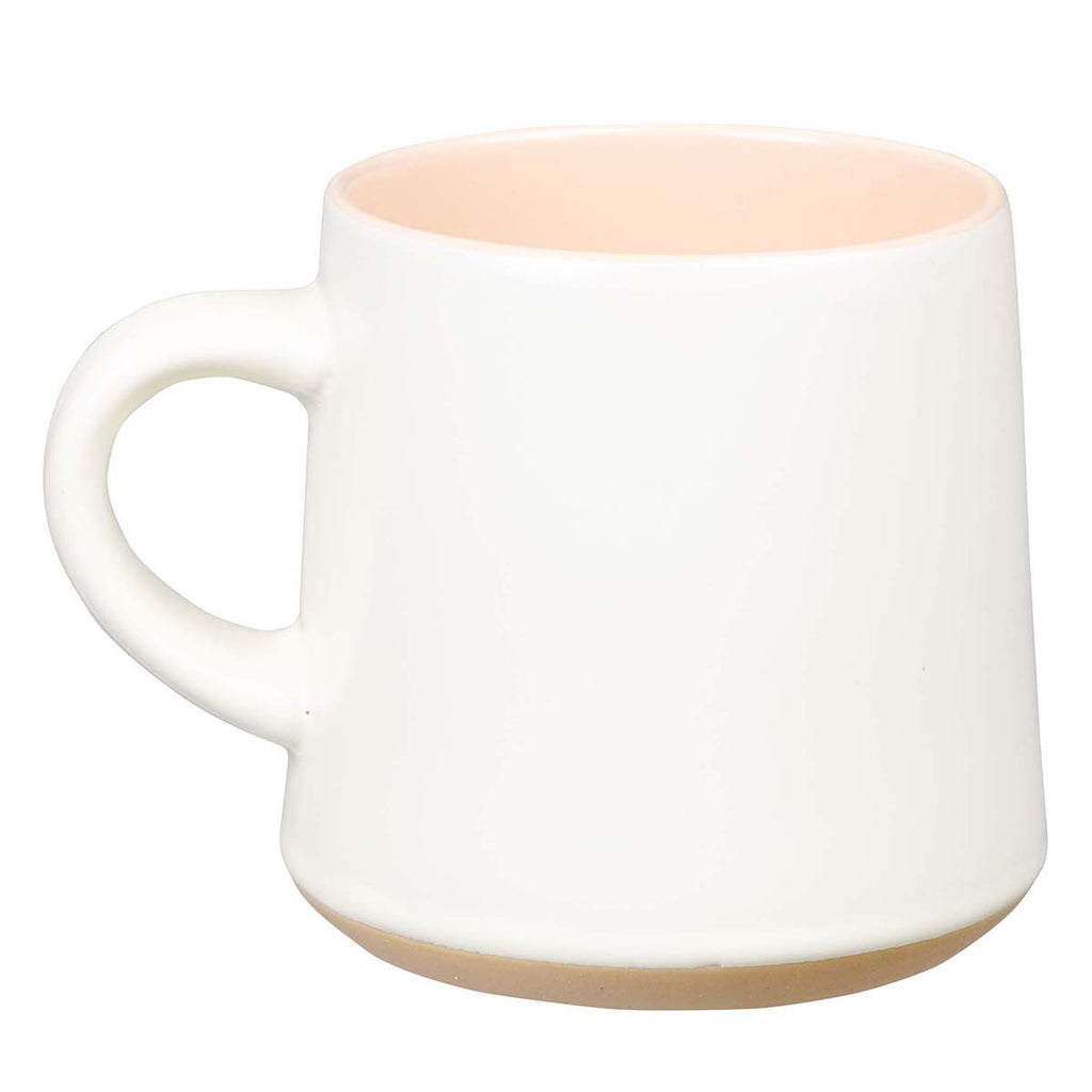 This cute ceramic mug has a unique shape with a wide base and narrower rim. The wide base lends extra stability, and the smaller rim helps maintain the temperature of the beverage. Its handle is thick and strong. The phrase