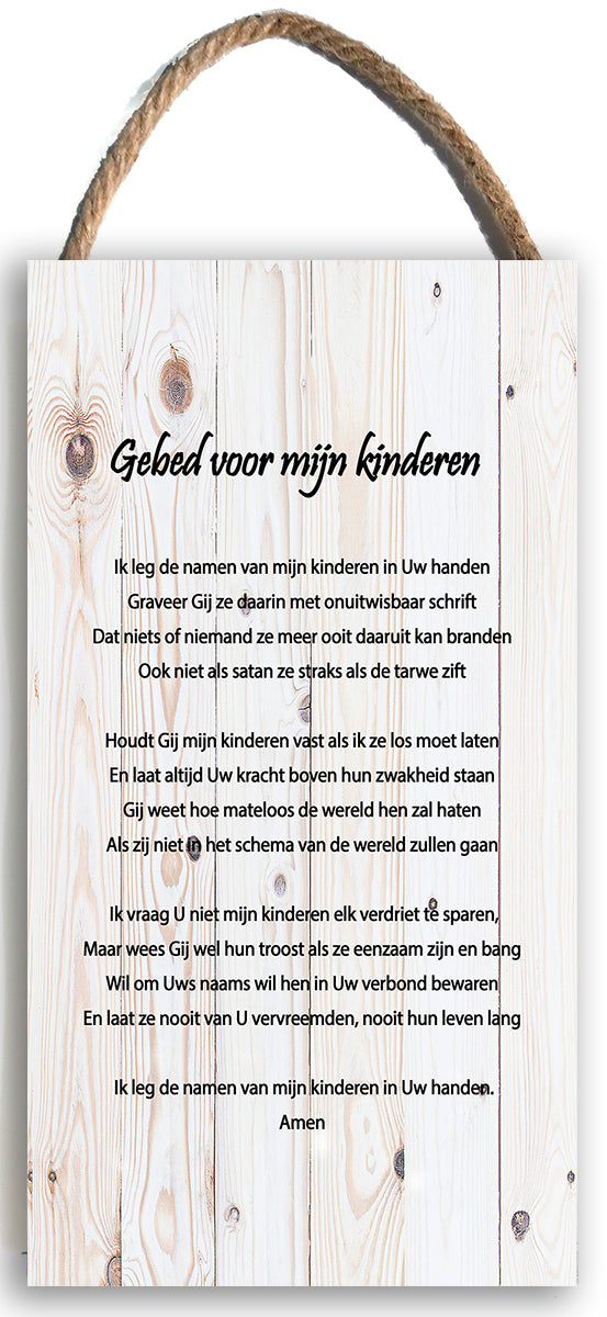 Prachtige witte houten hangbordje, met sisal touw. Met het gebed voor opgroeiende kinderen. Met een afmeting van 14x25 cm past dit charmante bordje perfect in elke slaapkamer.