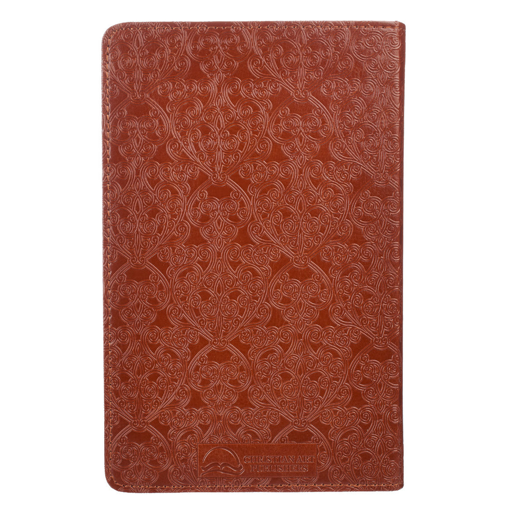 The brown faux leather cover of The Bible in 366 Days for Men of Faith Devotional is heat debossed with an intricate filigree design that starts on the back panel, wraps around the spine, and continues onto the front panel. A smooth faux patch with a heat debossed frame is topstitched on the front panel and holds the gold foiled title.