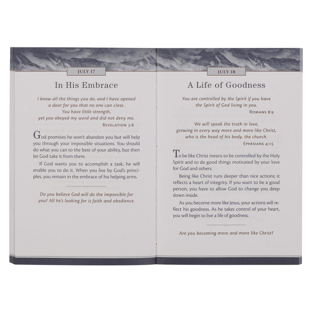 The softcover devotional features a majestic snowcapped mountain range that touches the sky. The panoramic view is topped by the title, which is presented in black UV-varnished lettering. Taupe UV-varnished scroll designs frame the title.