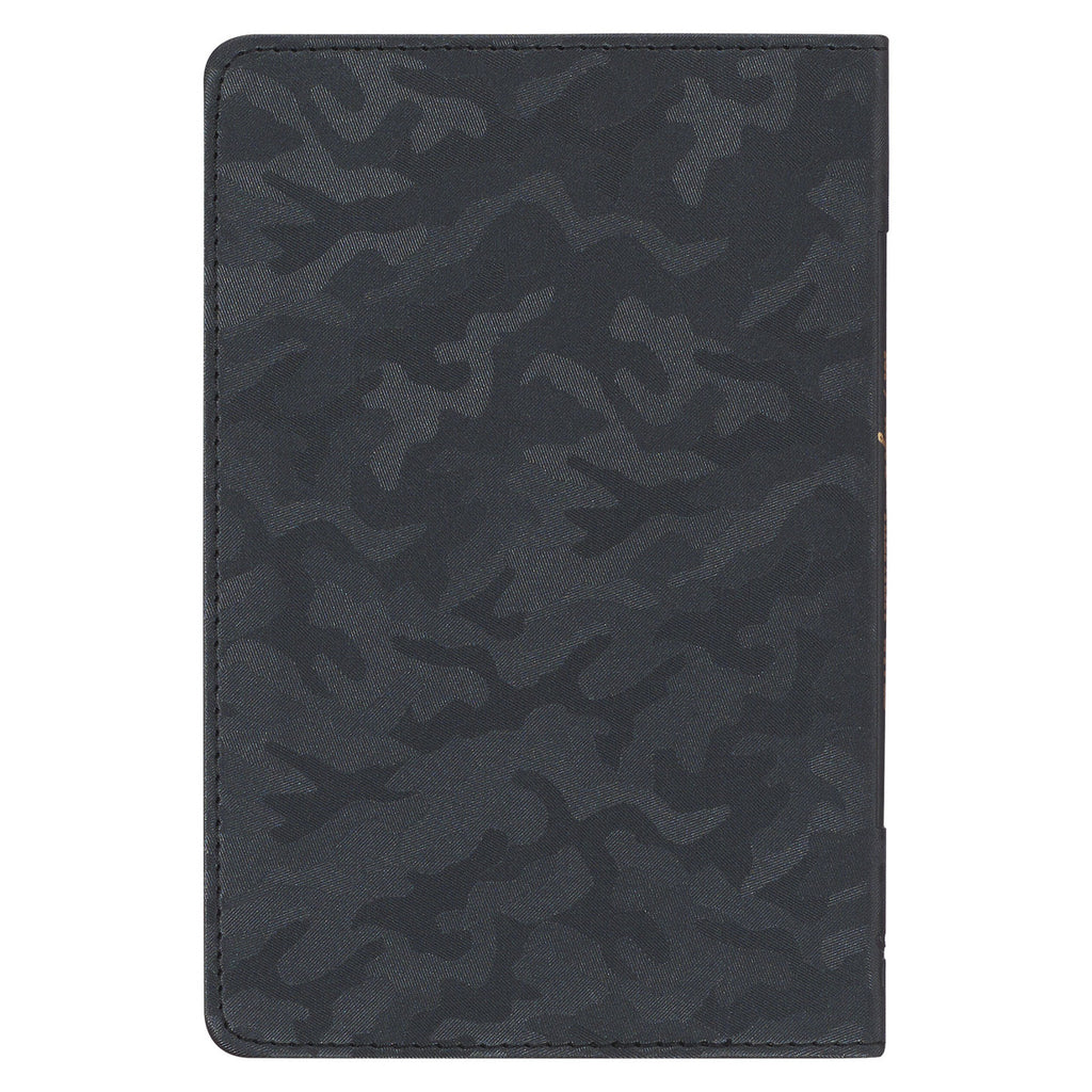 The flexcover gift book comes elegantly wrapped in charcoal gray faux leather, featuring a subtle camouflage design, symbolizing the strength and resilience of military spouses. A vibrant pink patch, tastefully appliqued onto the front cover and embellished with a double row of topstitching, is heat-debossed with a frame that highlights the gold-foiled title.