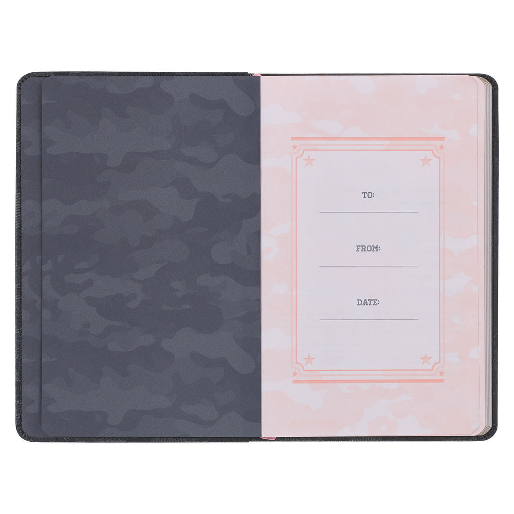 Inside, the two-tone pages are printed in black and accented with pink camouflage details, reflecting the blend of strength and femininity inherent in military wives. A pink satin ribbon marker is included, allowing readers to easily keep track of their progress. The gilded page edges add a touch of sophistication, elevating this book into a special keepsake.