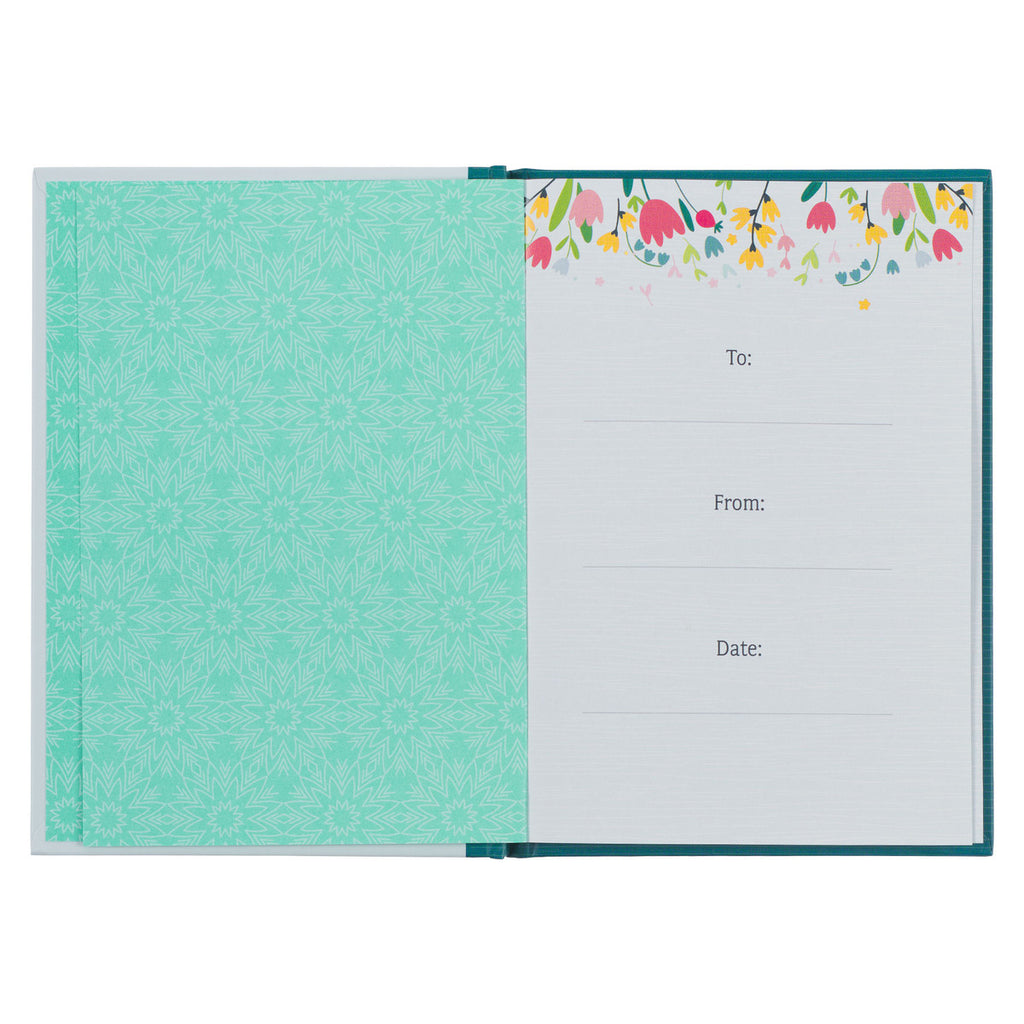 An open book growing bright flowers decorate the light teal front cover of the gift book and ground the title that is presented in multi-colored fonts.