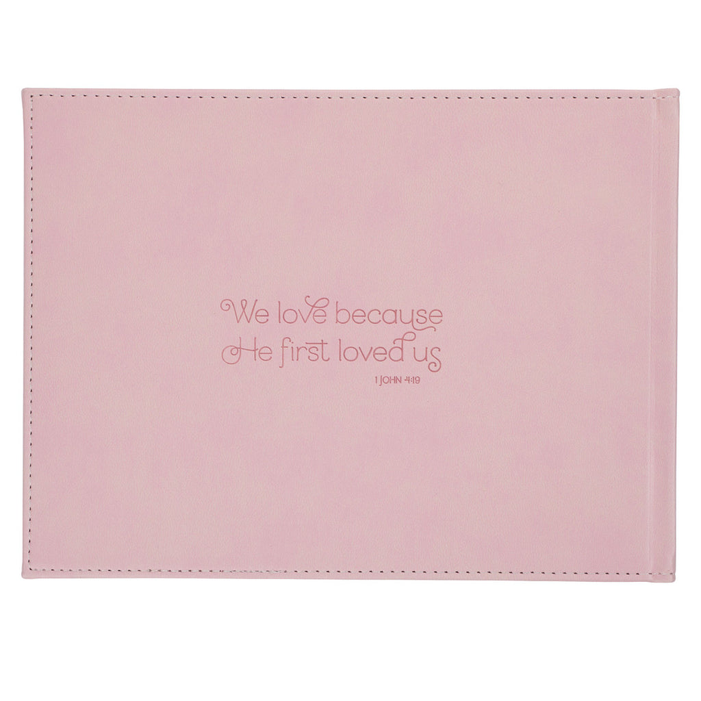 Gracing the exterior is a blush faux leather cover that seamlessly extends from the back panel over the spine, merging into a printed faux leather front panel. This white front panel showcases two elegant floral swags featuring plump pink and yellow roses that delicately flank the frame surrounding the title. The title itself is tastefully embossed in copper-foiled letters that harmoniously coordinate with the copper-foiled border of the frame.