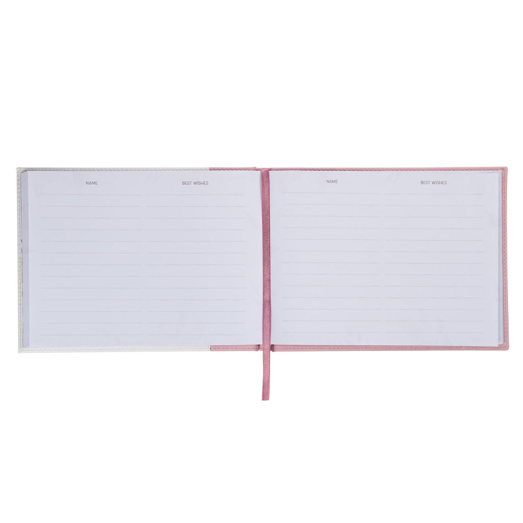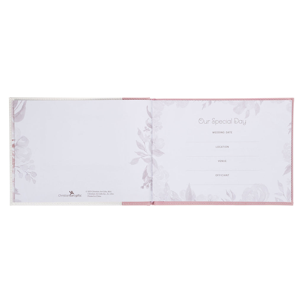 Inside, a monochromatic layout elegantly incorporates inspirational Scripture verses between the lined pages. To mark pages easily, a satin ribbon marker adds a touch of class. With 160 lined pages, there's ample space for guests to acknowledge their attendance and pen down special notes. For added convenience, this charming guest book is packaged in an acetate gift box, making it an ideal gift and ensuring its safe storage.