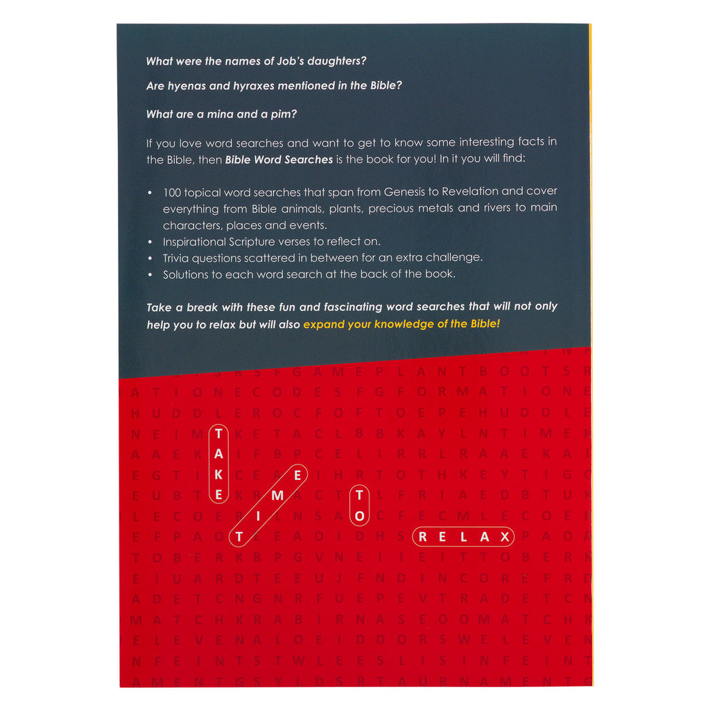 The interior pages are white, printed in black, and contain 100 captivating word searches. These puzzles vary in difficulty and cover biblical topics from Genesis to Revelation. Not only will you relax and unwind as you search for the words, but you will also discover interesting facts about Bible times, places, and people. Each word search has a Scripture verse to reflect on, and as an added bonus, trivia questions have been scattered throughout for an extra challenge. If you're stuck on a puzzle, don't worry; all solutions are provided at the back of the book.