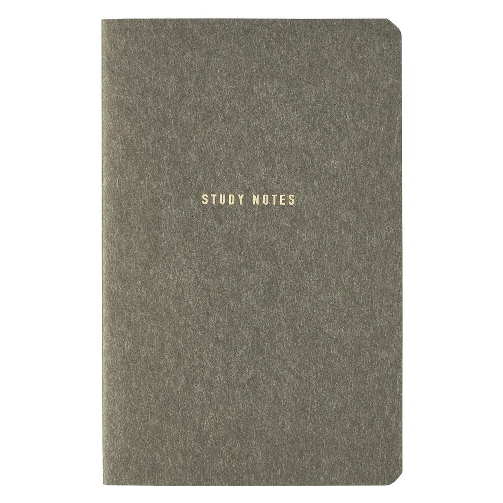 The outside cover of the Study Notebook is constructed from greenish-gray specialty cardboard that reminds one of hand-pressed paper. The title is gold foiled in capital letters and centered on the front cover.