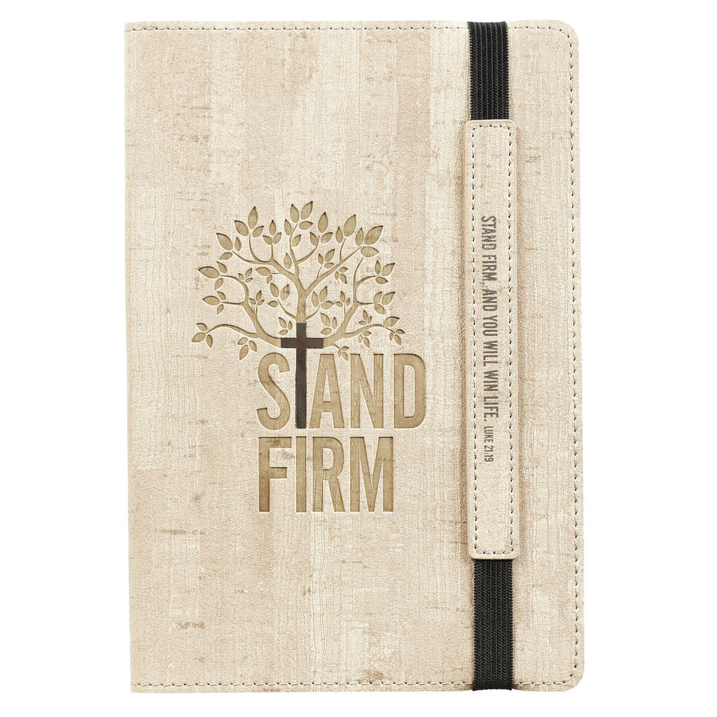 The Stand Firm Flexcover Dotted Journal features a LuxLeather flexcover with an elastic band closure. The closure keeps notes and loose papers safe inside. The verse from Luke 21:19, is debossed on a rectangular patch on the elastic band closure while a debossed tree with an embedded cross adorns the front cover. A debossed cross, the words STAND FIRM and the Scripture reference Luke 21:19 are debossed on the back cover.