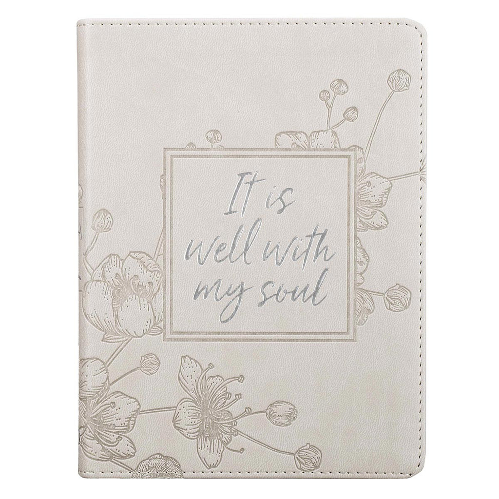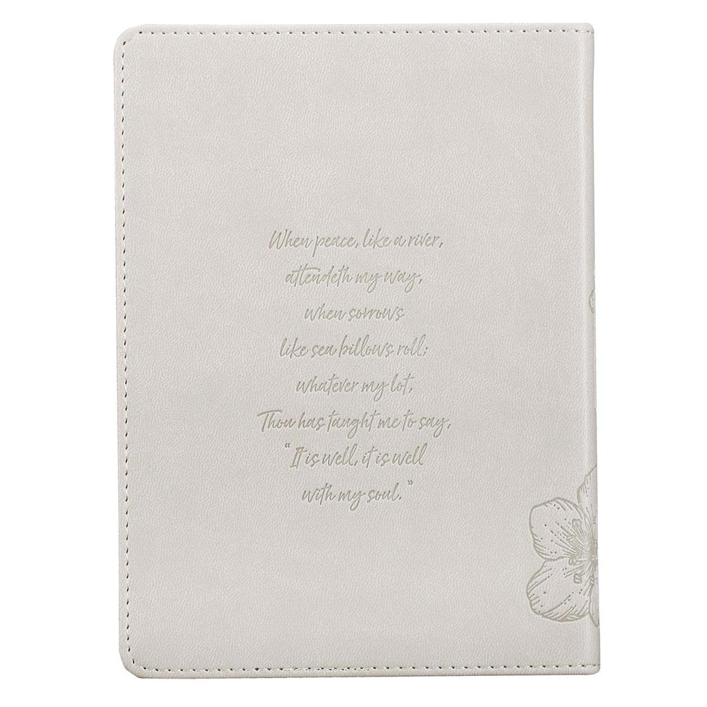 This gorgeous taupe It Is Well Handy-sized Faux Leather Journal emphasizes the tranquility and beauty found in the bold, ageless, and peace-bringing lyrical quote, “It is well with my soul.” Backed by a heat-debossed branch of delicate orchids rests a geometric box containing the timeless lyric, which is written in brush-script and foiled in dappled silver. Journaling is an exercise that brings tranquility and understanding, and therefore the journal being used should match the goal of the writing: a well-ordered soul. This product is from our extensive It is Well Collection that attempts to bring small bits of peace and loveliness into daily life with both useful and beautiful items that all sing the same message: “It is well with my soul!”