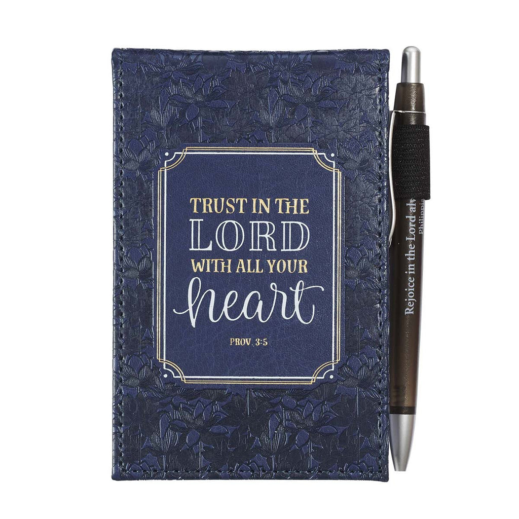 The stylish navy blueTrust in the Lord Notepad with Pen bears the words from Proverbs 3:5,