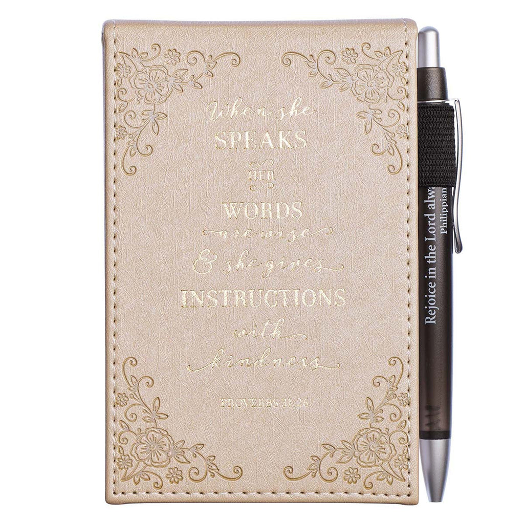 The Proverbs 31 woman is the inspiration for the When She Speaks Faux Leather Notepad & Pen. The taupe faux leather cover features verse 26,