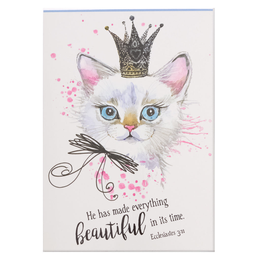 This cute princess kitty notepad gives the reminder that we are all made beautiful in time. Keep the notepad by the phone or on your desk to write down important messages. Each page has a full-color image of the cover at the bottom and Scripture verse with plenty of white space for writing a reminder or to-do list.