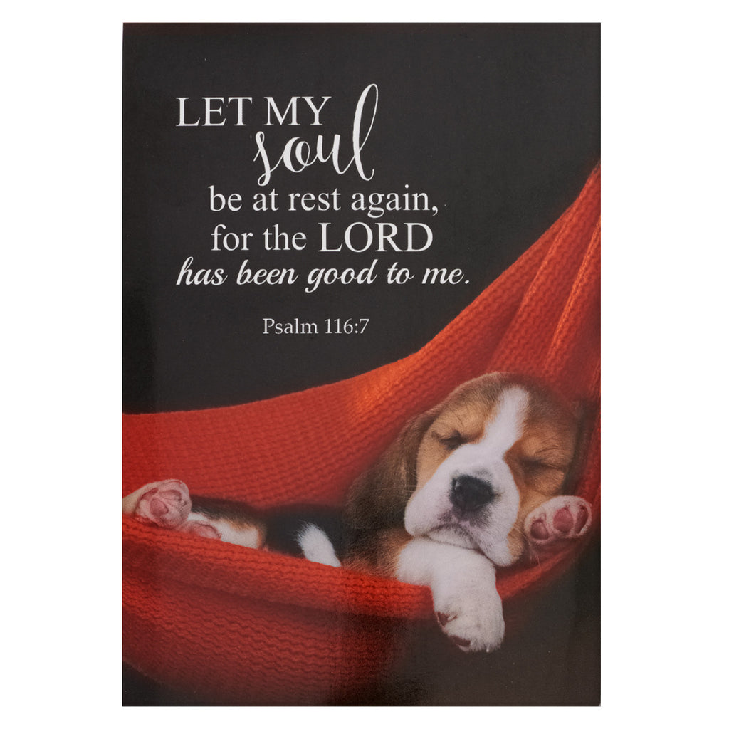 Take rest and comfort in knowing that the Lord has you under His wing of protection. This notepad which features the verse from Psalm 116:7, “Let my soul be at rest again, for the Lord has been good to me,” is a reminder that all should take that moment in their day and reflect on the Lord’s goodness. The cover also features a photograph of an adorable puppy, sleeping snuggly in a hammock. Just like we are the Lord’s children, we too should take moments to still our hearts and focus on the goodness of the Lord.