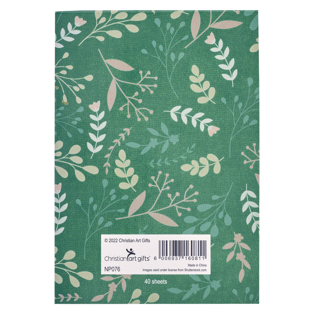 The back cover of the notepad is colored a dark green with colorful floral stems to match the border on the front cover. The cover is sturdy enough for writing on the go, and the 40 blank tear-off pages leave you plenty of room to write down your thoughts and ideas. Each page is grounded by a border that imitates the front cover's design.