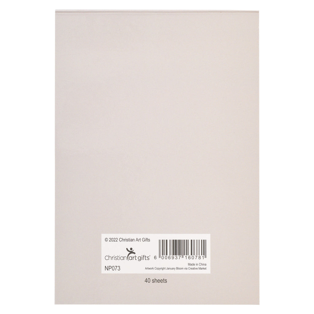 The neutral taupe front cover of the notepad is adorned with delicate purple lilies. The sentiment is printed in a black font at the top and followed by the Scripture reference printed at the bottom.
