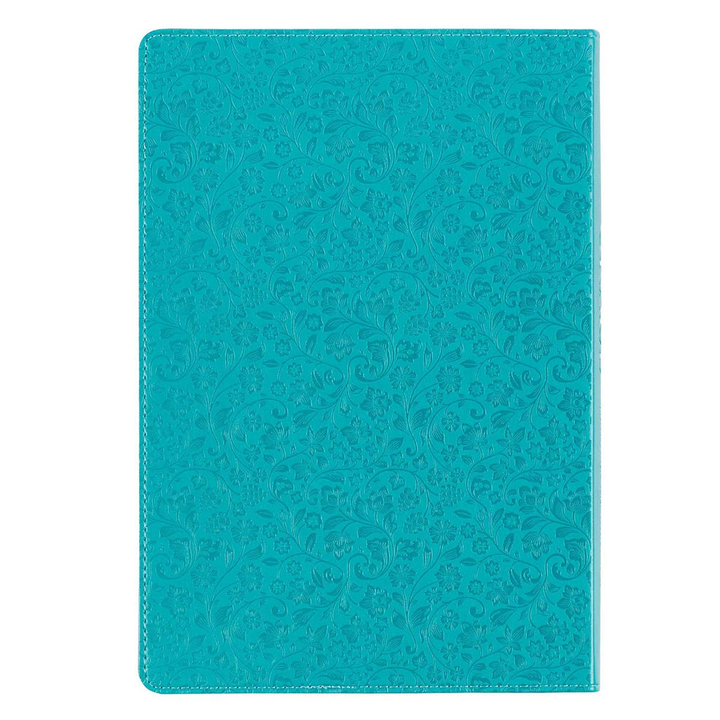 The devotional's teal faux leather cover is covered with a heat debossed creeping floral vine design. The title and subtitle are heat debossed and silver foiled on a double topstitched appliquéd faux leather patch.